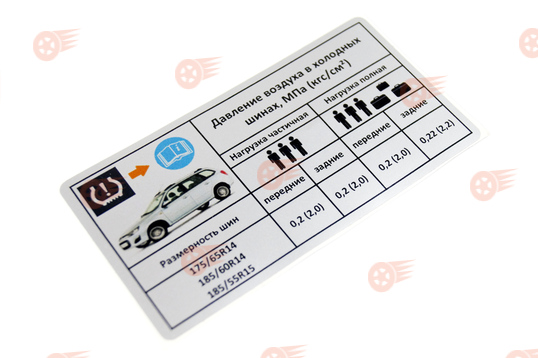 Несоблюдение правильного давления в шинах при эксплуатации автомобиля может приводить к преждевременному износу шин, а также негативно влияет на управляемость и увеличивает расход топлива. Для удобства использования информационную табличку можно приклеить на дверной стойке в салоне автомобиля (проеме водительской двери) или на любом другом видимом месте.