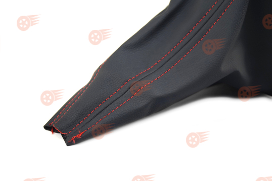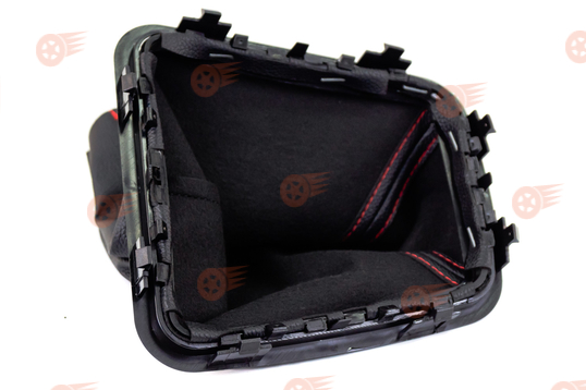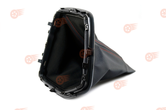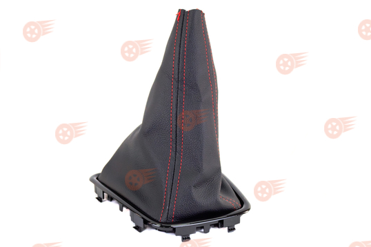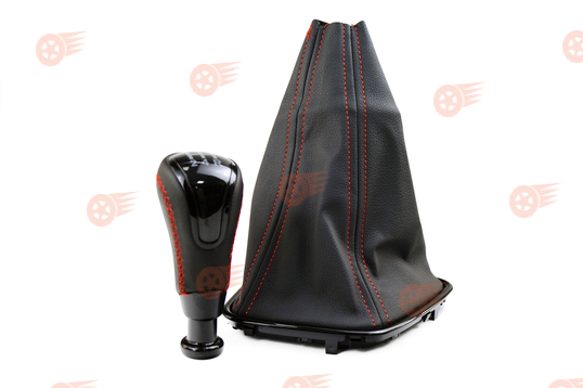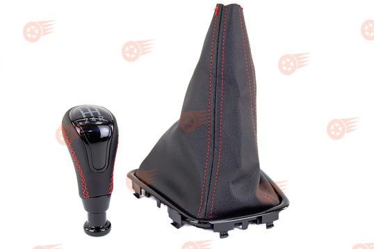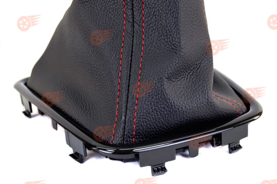 Ручка КПП в стиле Vesta с пыльником, черные лаковые вставка и рамка, красная строчка Sal-Man на Лада Приора 2 с тросовым приводом