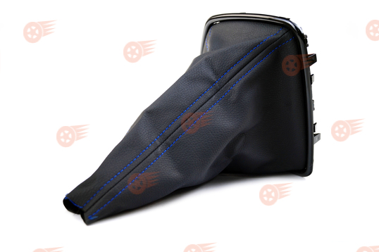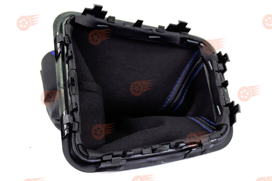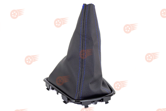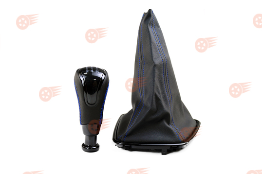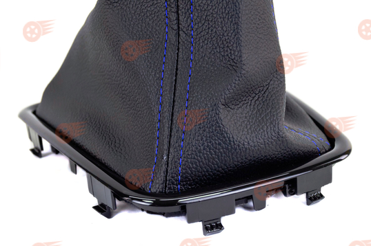 Ручка КПП в стиле Vesta с пыльником, черные лаковые вставка и рамка, синяя строчка Sal-Man на Лада Приора 2 с тросовым приводом