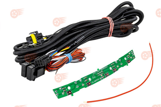 Комплект: 2 ПТФ, 2 рамки, 2 кронштейна, кнопка, плата, реле, проводка