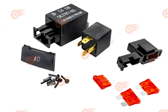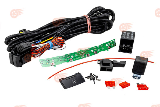 Комплект: 2 ПТФ, 2 рамки, 2 кронштейна, кнопка, плата, реле, проводка