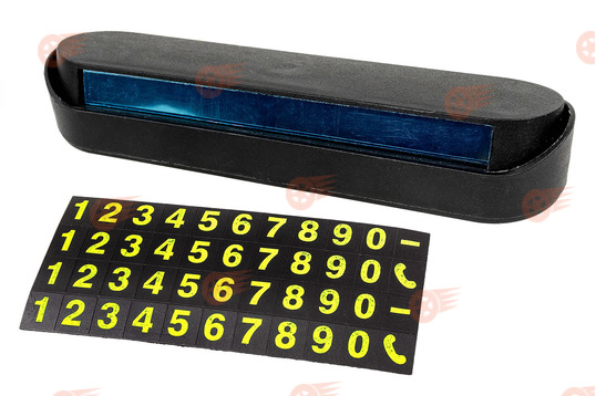 Универсальная парковочная визитка изготовлена из прочного черного пластика, поставляется с набором цифр и символов, предназначена для установки на панели торпедо любого автомобиля. Визитка позволяет оставить контактный номер автовладельца для связи с ним в случае помехи для других транспортных средств, позволяя обойтись без вызова эвакуатора, что особенно актуально при парковке в условиях загруженного города.