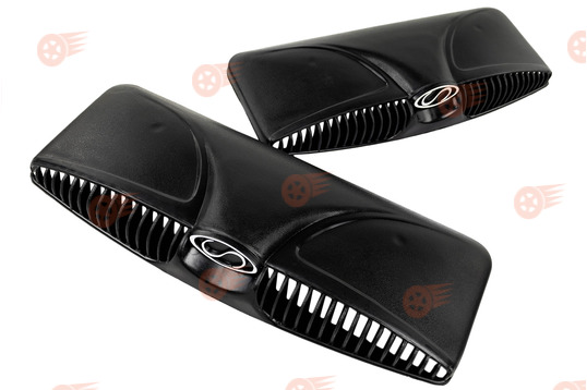 Комплект включает два воздухозаборника капота, применяется для тюнинга автомобилей ВАЗ классического семейства. Воздухозаборники изготовлены из ударопрочного черного пластика, устойчивого к выгоранию и температурным перепадам. Накладки выполняют декоративную функцию, придавая экстерьеру автомобиля агрессивные спортивные черты, а также защищают систему вентиляции салона от попадания крупного мусора и влаги и улучшают приток воздуха к двигателю и системе охлаждения автомобиля за счет перенаправления воздушного потока и улучшения аэродинамики.
