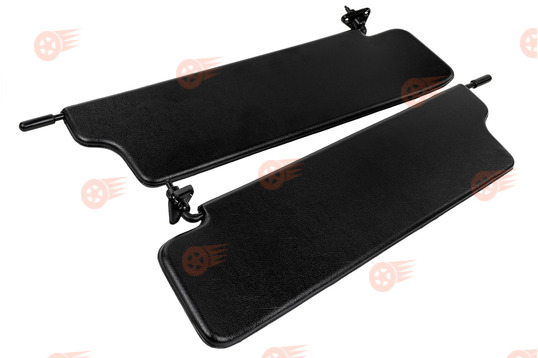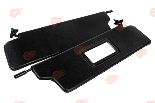 Комплект солнцезащитных козырьков выполнен в черном цвете с обеих сторон, оснащен зеркалом на пассажирском козырьке, поставляется с центральным кронштейном. Козырьки функционируют в двух режимах: стандартное открытие сверху вниз, а также откидывание в боковую сторону в горизонтальной плоскости путем отсоединения их с крючка во внутренней части.